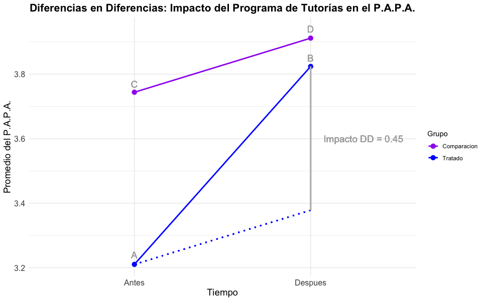 Impacto DD = (Promedio PAPA en el grupo tratamiento después - Promedio PAPA en el grupo tratamiento antes) - (Promedio PAPA en el grupo comparación después - Promedio PAPA en el grupo comparación antes) = (B-A) - (D-C)
