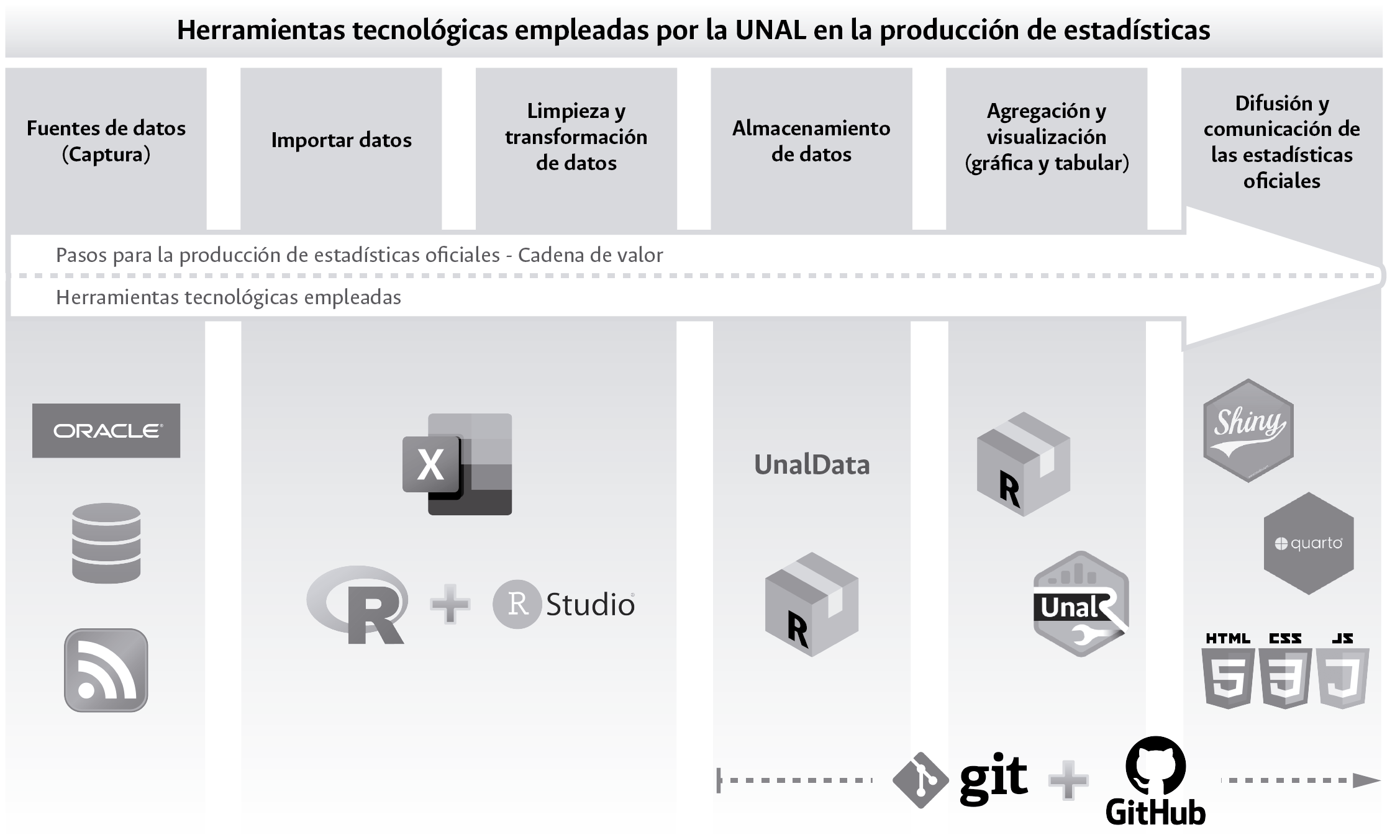 El paquete de datos UnalData almacena, en un entorno privado, desde el año 2008, el total de microdatos que sirven de fuente para la consolidación de las estadísticas oficiales y la publicación de microdatos en el portal de datos abiertos del Estado.