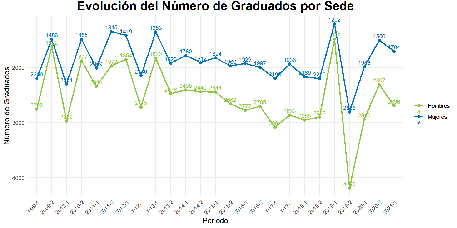 Plot.Series(datos = ejConsolidadoGrad,categoria ="SEXO",invertir =TRUE,colores =c("#8CC63F", "#0071BC"),titulo ="Evolución del Número de Graduados por Sede",labelY ="N\u00famero de Graduados",libreria ="plotly")